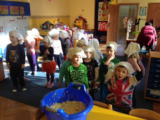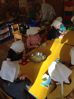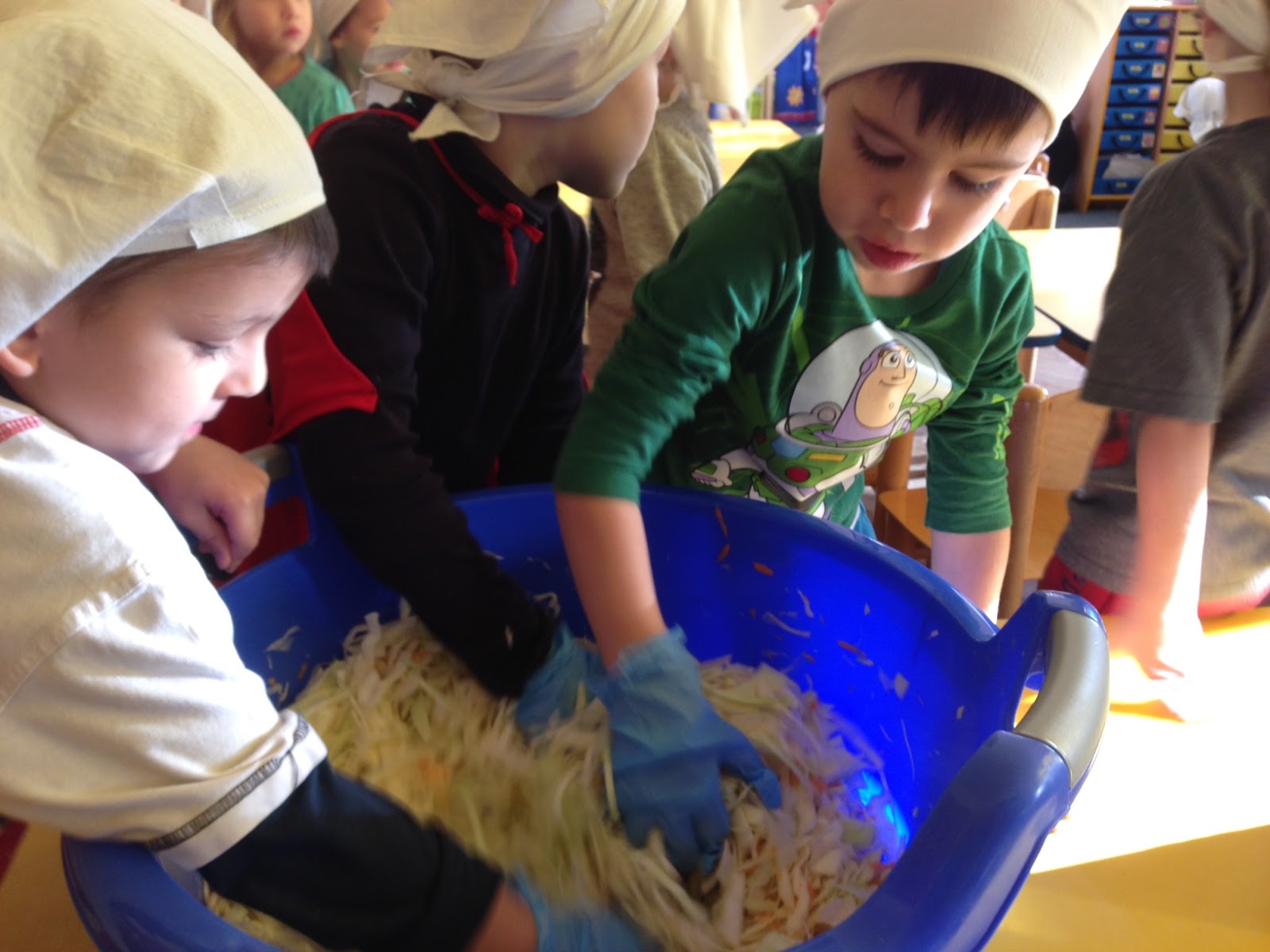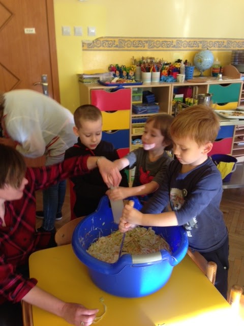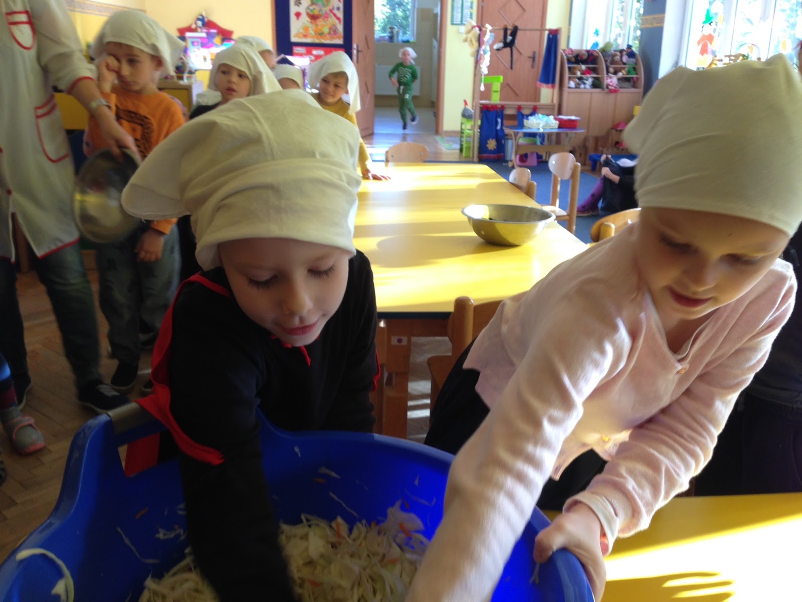 31.10.2017 r. w ramach cyklu dydaktycznego pt. " Przygotowania do zimy" postanowiliśmy własnoręcznie ukisić kapustę. Krojenie okazało się wielkim wyzwaniem, z którym poradziliśmy sobie na medal. Jednak najfajniejsze w kiszeniu było mieszanie i ubijanie kapusty. Teraz pozostało Nam tylko poczekać na efekty naszej pracy i cieszyć się smakiem zdrowej i smacznej kiszonej kapusty.