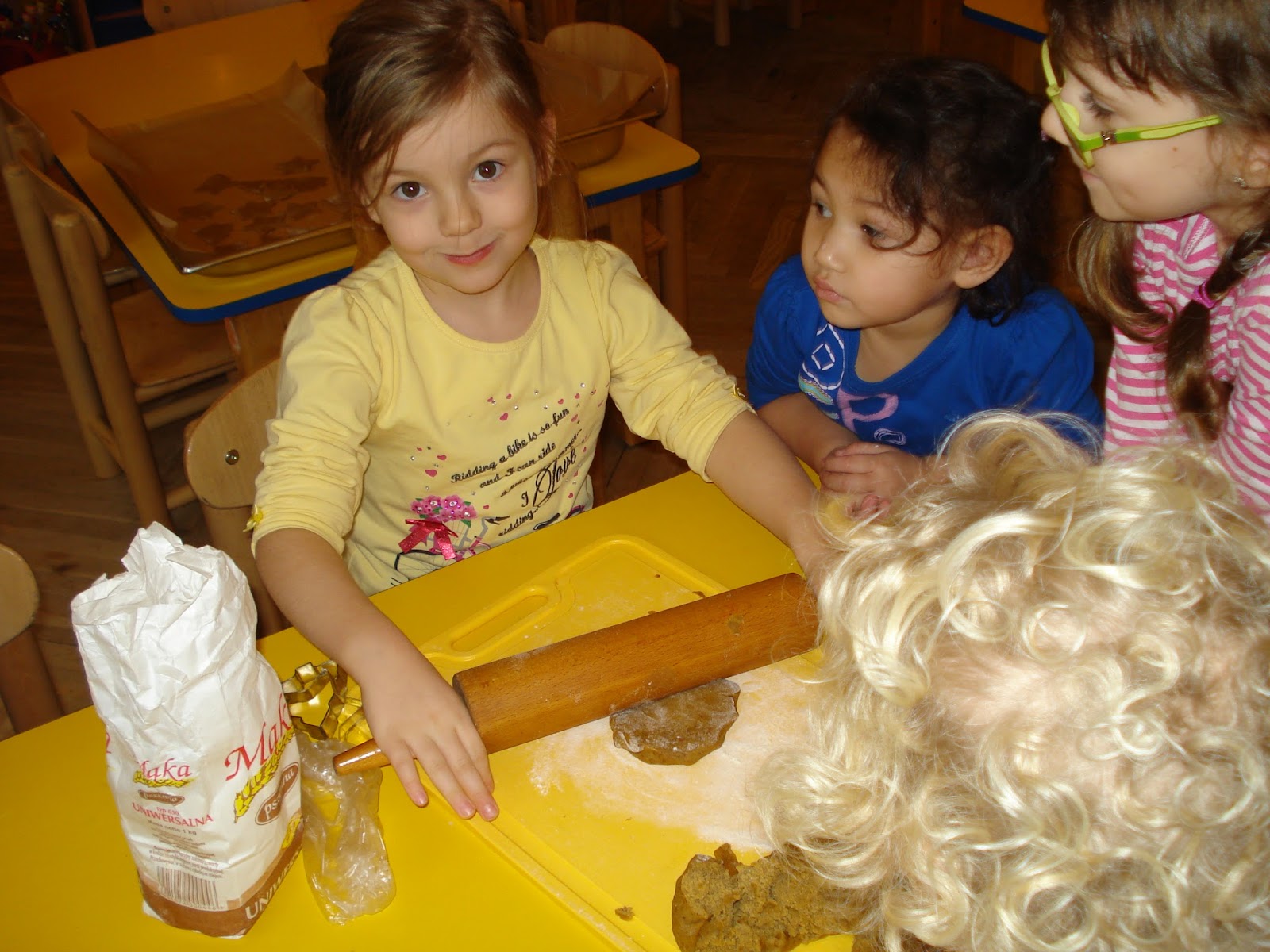 Jak nakazuje świąteczna tradycja dzieci piekły i dekorowały piernikowe ciasteczka. Sprawiało im to wiele radości, szczególnie wałkowanie ciasta i wycinanie różnych kształtów. Skrzaty postanowiły zabrać ozdobione pierniczki do domu . Nie zapomniały o obdarowaniu ciasteczkami innych grup , składając przy okazji Świąteczne Życzenia Wesołych Świąt.