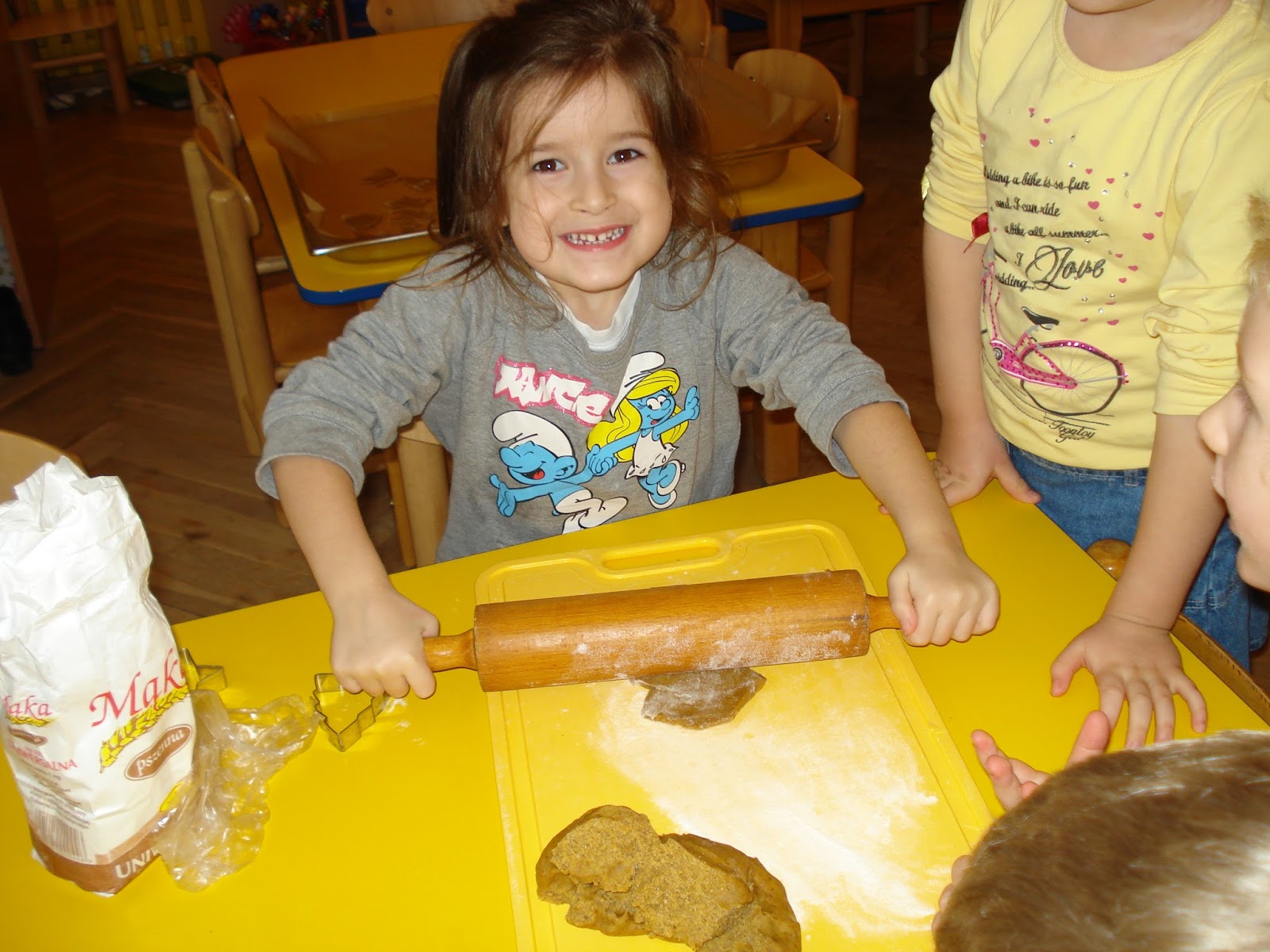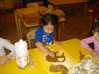 Jak nakazuje świąteczna tradycja dzieci piekły i dekorowały piernikowe ciasteczka. Sprawiało im to wiele radości, szczególnie wałkowanie ciasta i wycinanie różnych kształtów. Skrzaty postanowiły zabrać ozdobione pierniczki do domu . Nie zapomniały o obdarowaniu ciasteczkami innych grup , składając przy okazji Świąteczne Życzenia Wesołych Świąt.