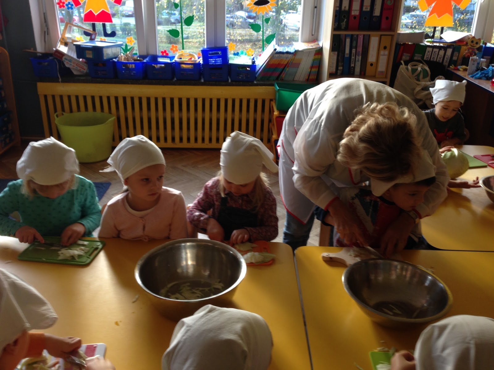 31.10.2017 r. w ramach cyklu dydaktycznego pt. " Przygotowania do zimy" postanowiliśmy własnoręcznie ukisić kapustę. Krojenie okazało się wielkim wyzwaniem, z którym poradziliśmy sobie na medal. Jednak najfajniejsze w kiszeniu było mieszanie i ubijanie kapusty. Teraz pozostało Nam tylko poczekać na efekty naszej pracy i cieszyć się smakiem zdrowej i smacznej kiszonej kapusty.